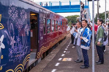 山陰本線が全線開通 2025年10月4日 最終更新日時 : 2025年10月4日 nagato 「〇〇のはなし」を出迎える江原市長、前田市長、飯田支社長 2023年6月の大雨で被災し不通となっていた山陰本線・人丸~滝部駅間が9月27日、2年3カ月ぶりに運転を再開した。これにより、長門市~小串駅間の山陰本線全線が復旧した。